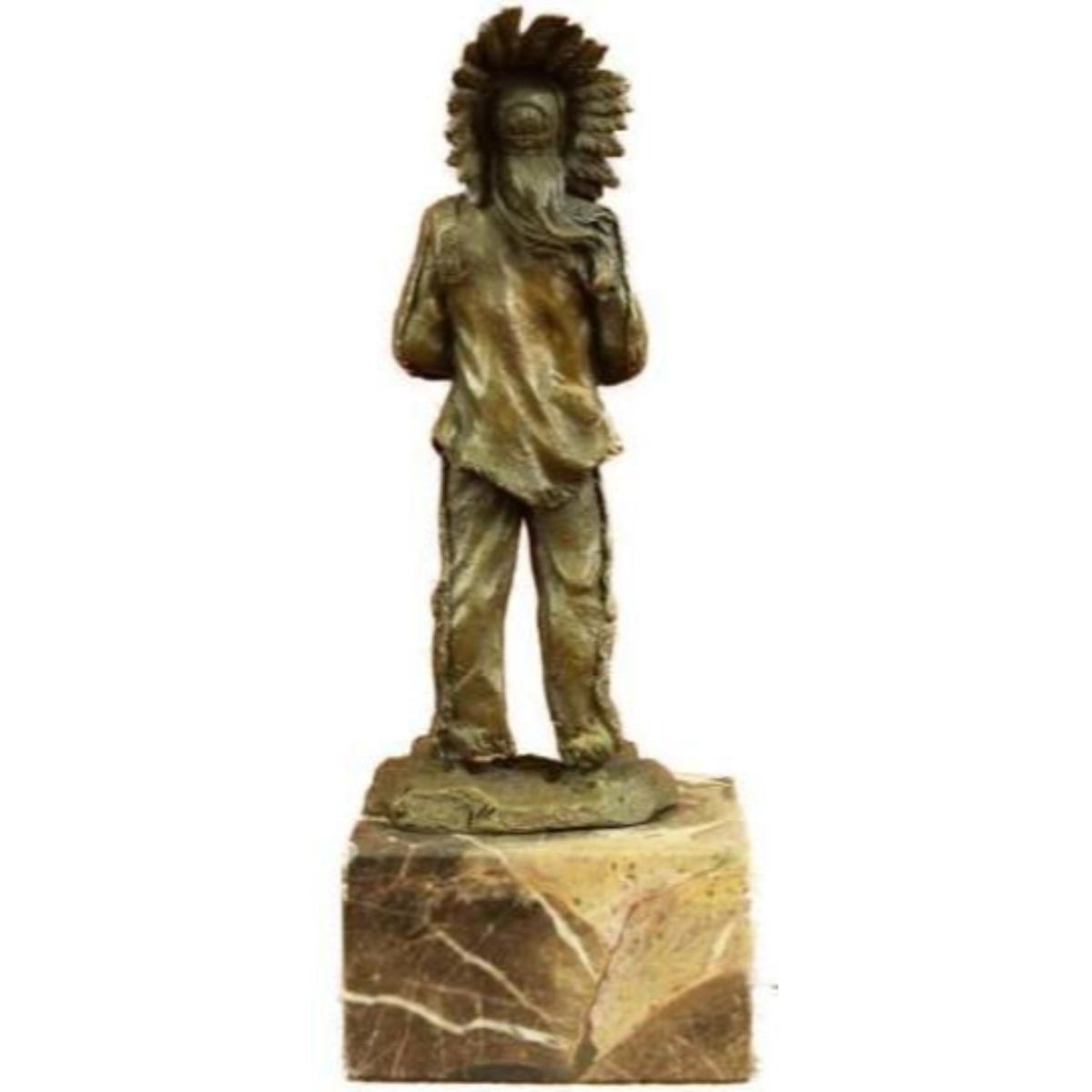 Native American shaman, holding an ox head sculpture. Signed "Coypel". Lost wax casting method bronze, with brown patina, mounted on marble base. 9 1/2" X 4". 6lbs.