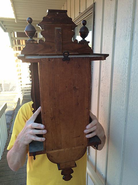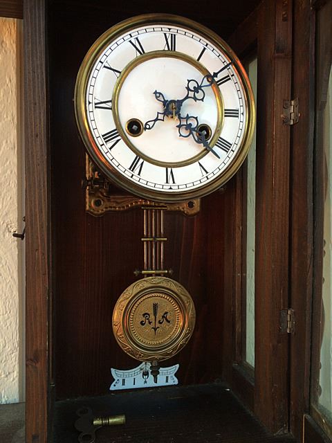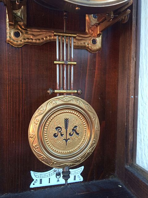 Miniature Vienna Regulator Clock with finials, carved crest, porcelain dial, ornate pendulum, measures 31" tall x 13" wide x 7" deep..