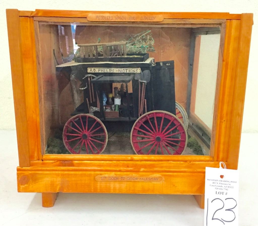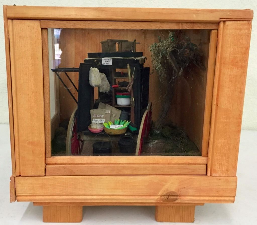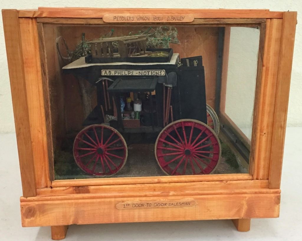 Titled “Peddlers Wagon 1870s”. Signed D. Bailey. This highly detailed miniature wagon diorama is in its own display case which measures 14 inches square. Please look closely at pics - they are an important part of our description. Shipping: There will be a $10 handling / packaging fee for shipping this lot. The actual cost of postage will be added on top of that.