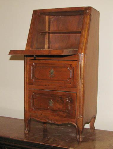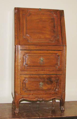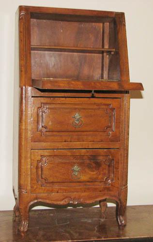 Title: Miniature Walnut Secretary with fold out slanted top with shelf and 2 drawers