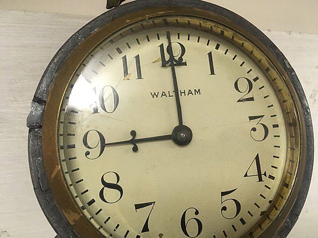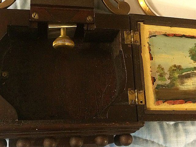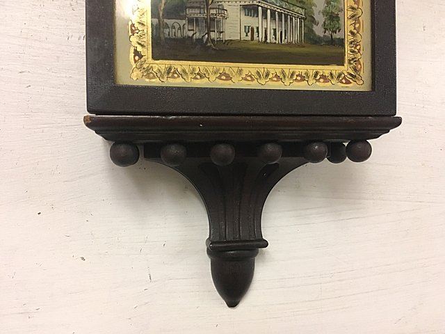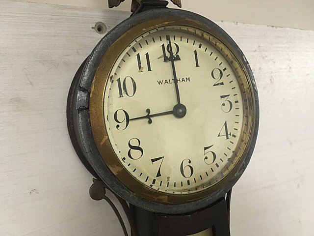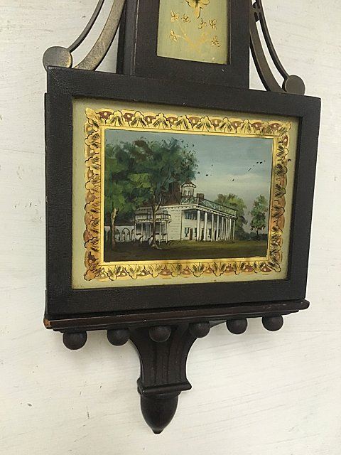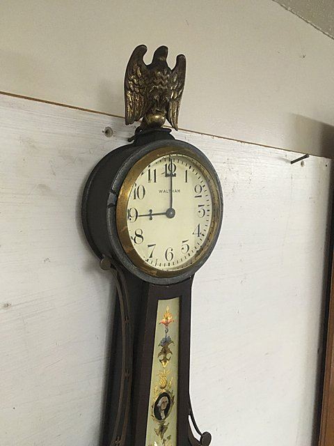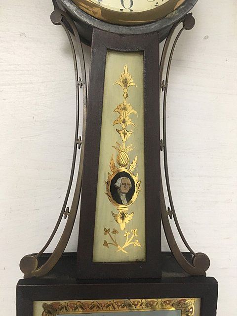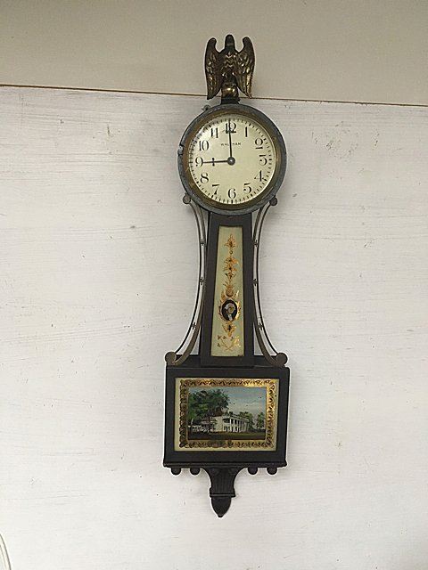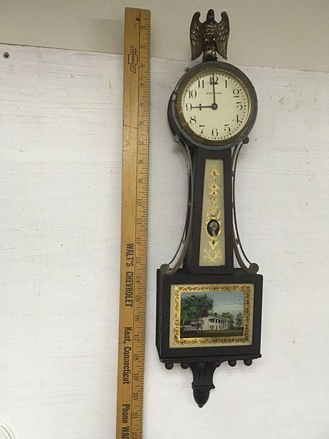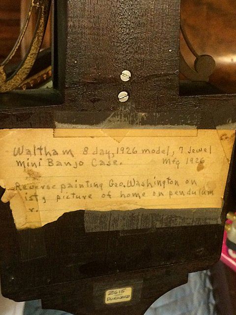 Very rare miniature key wind (from bottom) Waltham Banjo Clock. Very hard size to find, bust of George Washington on neck, Mt. Vernon painted on glass, eagle finial. Very similar miniature version of the clock in lot 31A. Has some leading that has come off, but owner saved it, so can be repaired. Has tag marked "Waltham 8 day, 1926 model, 7 jewel mini banjo case. Mfg. 1926, Reverse painting Geo. Washington, picture of home on pendulum r." All original, measures approx. 20" tall.