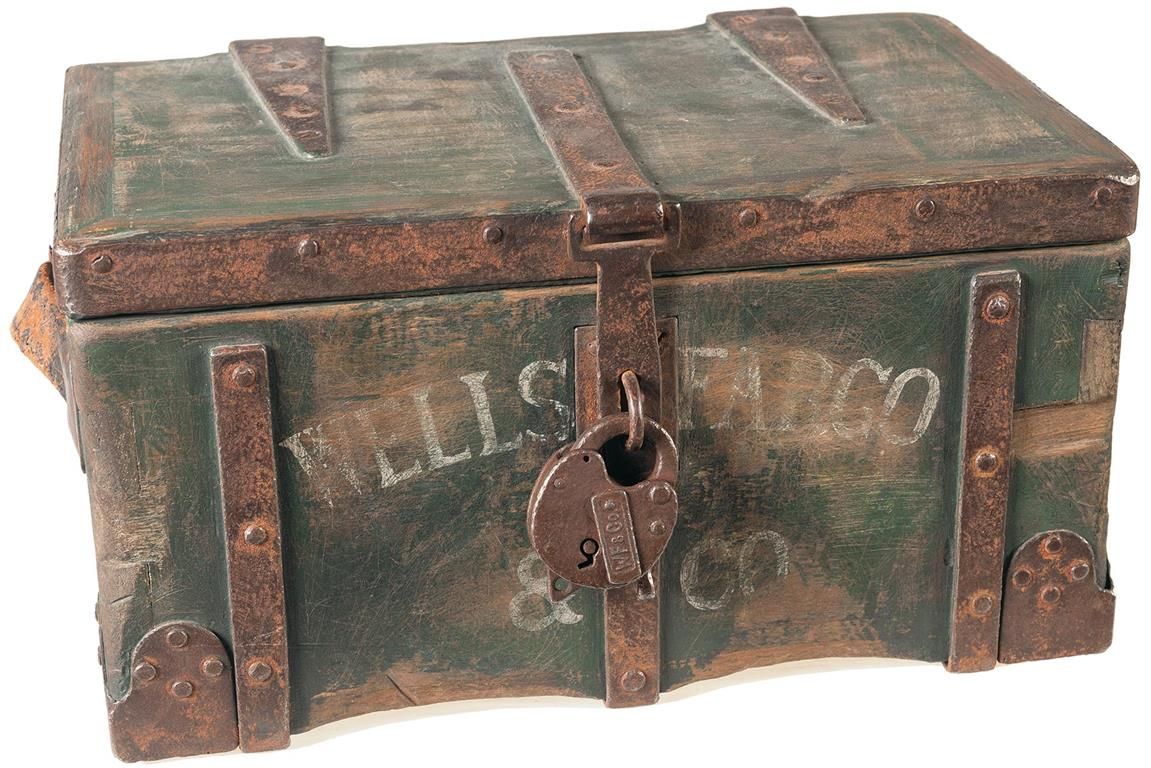 This "Miniature "Wells Fargo/& Co" marked wood and iron treasure box measures 12 1/2" x 7 1/2" x 7". Complete with a "WF & Co" marked padlock with key.