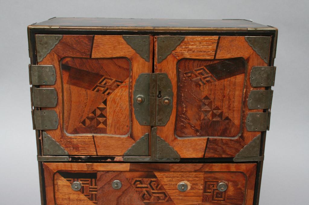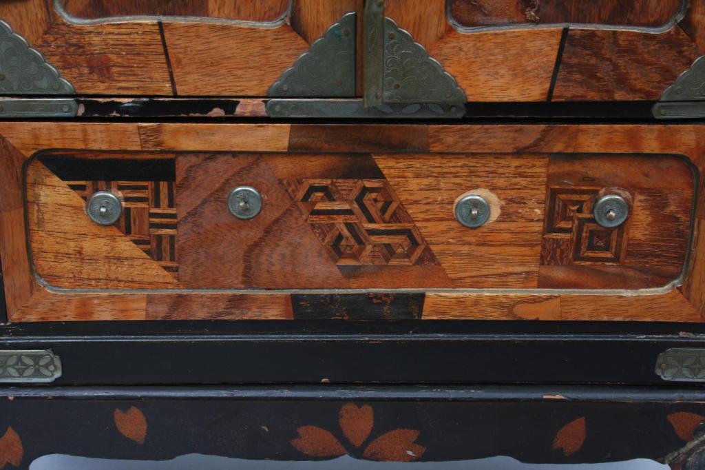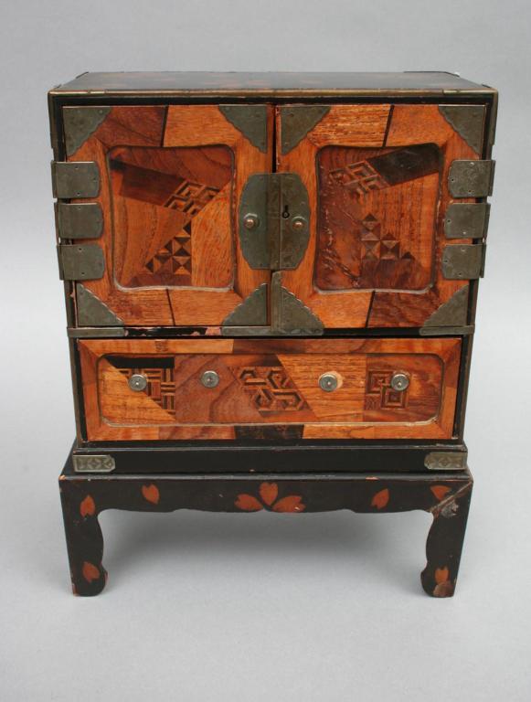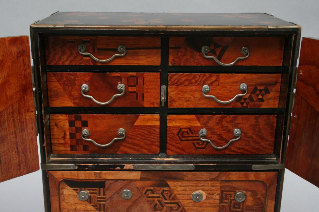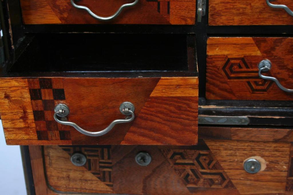 Early 20th century, the rectangular lacquered form with stenciled exterior decoration on the top and sides, the finely inlaid wooden doors opening to reveal an interior fitted with six inlaid short drawers fitted with white metal pulls, all above a single inlaid long drawer, raised on a stenciled lacquer base. Chest Only 8 3/4"H. 9 1/4"W. 4 7/8"D. Base 3 1/2"H. 9 7/8"W. 5 1/4"D. Condition: some light surface wear including light scratches, lacking one door hinge, two short drawers lacking pulls, long drawer lacking pulls.