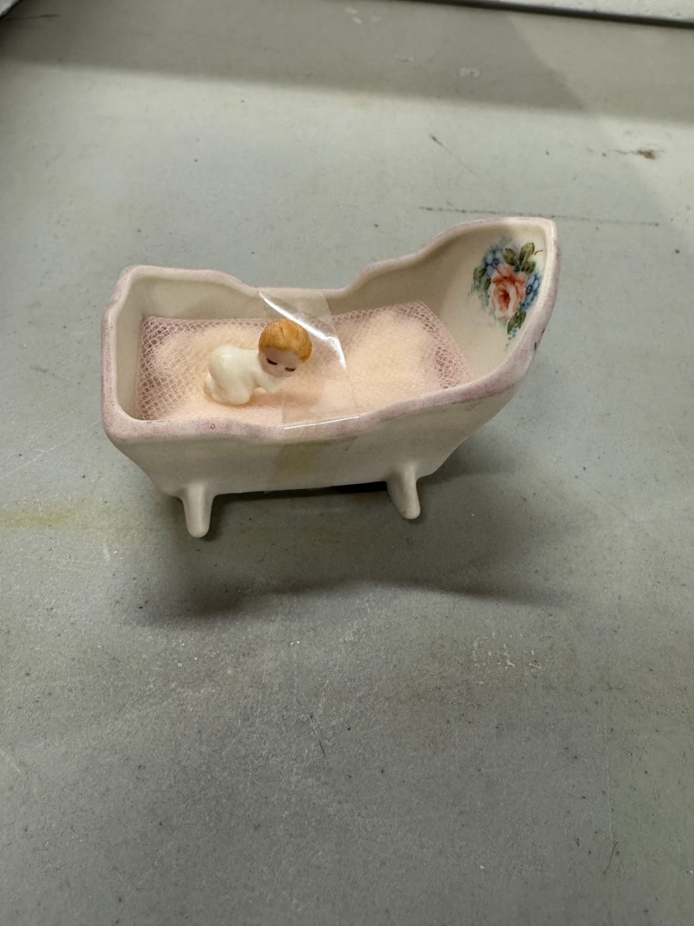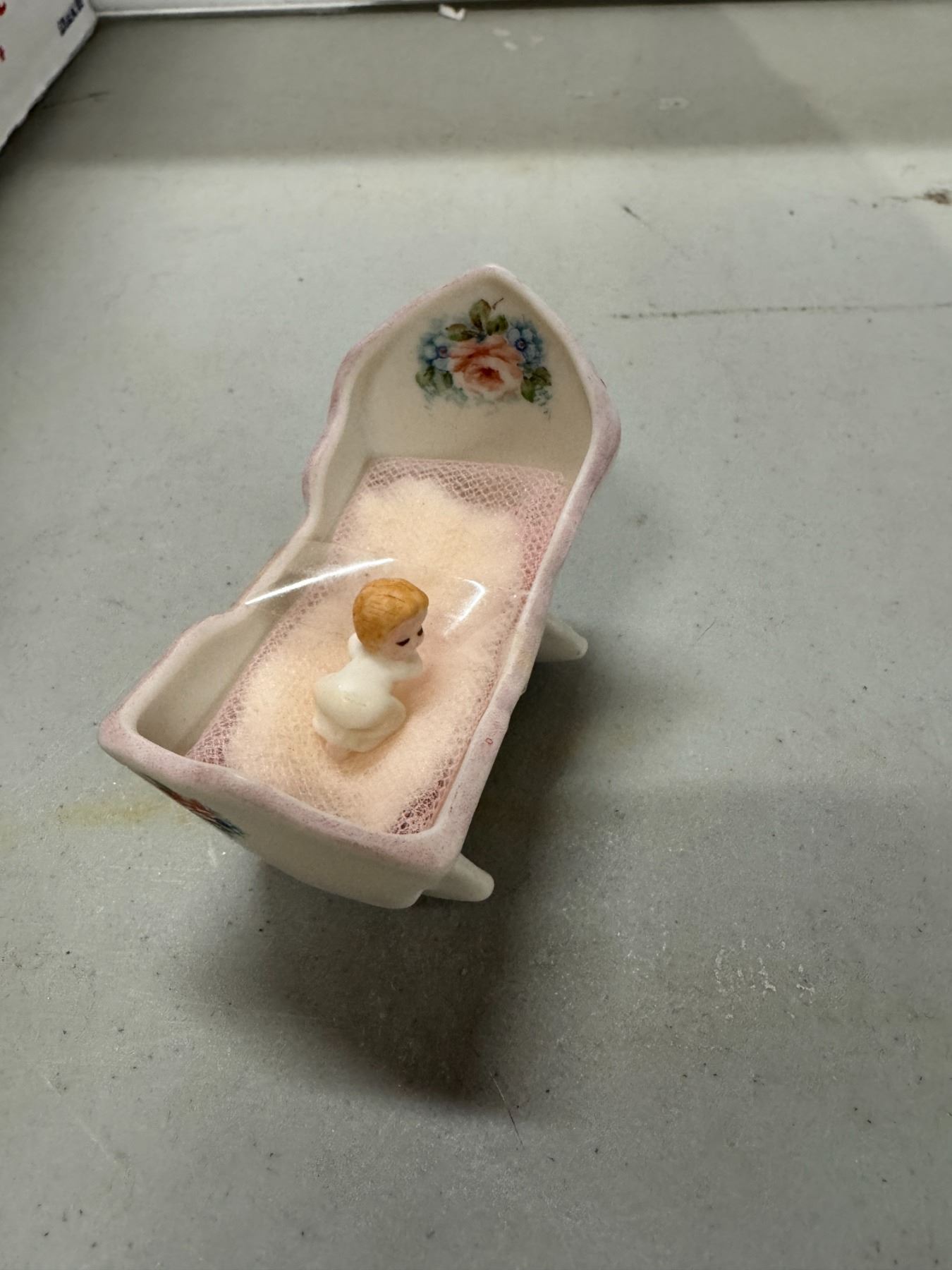 miniature baby in cradle signed