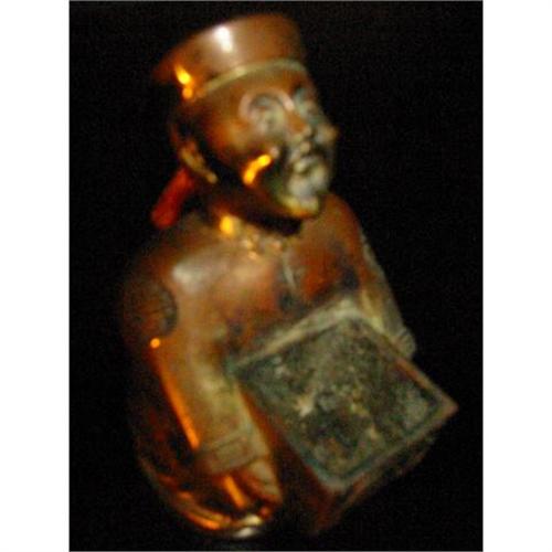 This 4 inch bust of a Chinese is of a metal decorated with fabric tassel in gold color. It is collectible with chinese signature. This little Chinese holding a planter box with signature in the interior of the planter. It also has a signature on the exterior of the bust. This figurine is in very good condition with vintage imperfection. Base is covered with green felt and the color of metal silver and gold tone combination of copper and bronze. It is highly detailed and engraved with chinese symbol. ion. the statue is 4 inch Tall, 2 inch wide and 2 inch base diam. it is beautiful and something to think about.