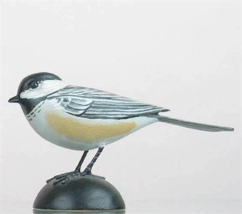Miniature chickadee by James Lapham in XOC. Raised carved wing tip detail. "James Lapham, Dennisport, Mass" and "Chickadee" written on the bottom of the base. (decoy)
