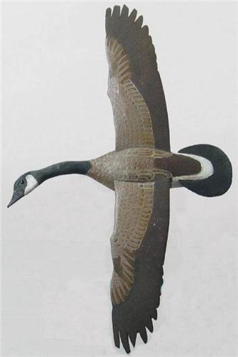 Miniature flying Canada goose with a 10 1/2 in wing span signed "A. J. Dando, "46" on the underside of the wing. Minor damage to the tips of some of the wing feathers. (decoy)