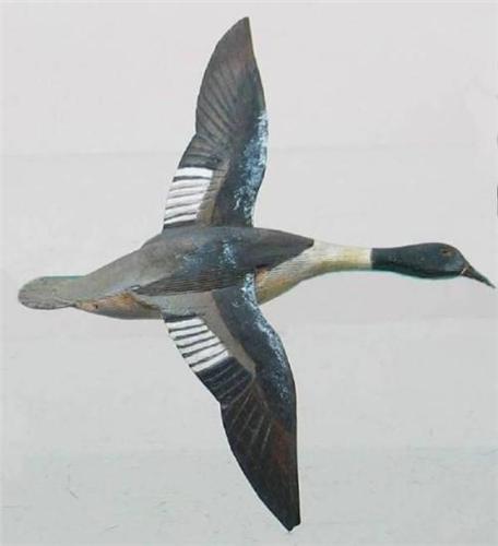 Miniature flying red breasted merganser drake with a 6 in wing span signed "A. J. Dando" on the underside of the wing under a wash of paint. Bill is broken and wing tips are damaged. (decoy)