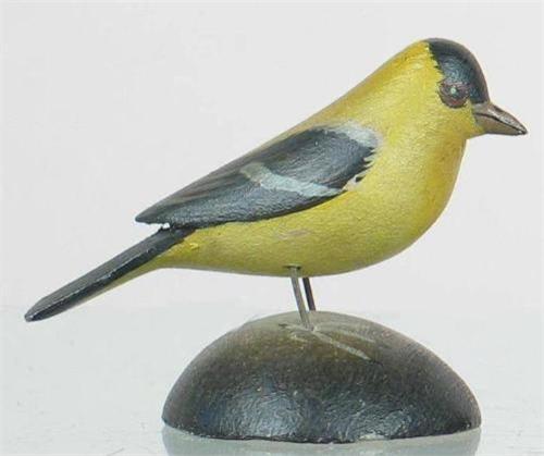 Miniature goldfinch by A. E. Crowell, East Harwich, MA in XOC. Rectangular impressed brand on the bottom of the base
