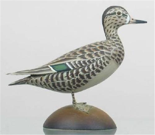 Miniature green wing teal drake with raised split wing detail. "Green Wing Teal" and "James Lapham, Dennisport, Mass" on the bottom in ink. XOC (decoy)