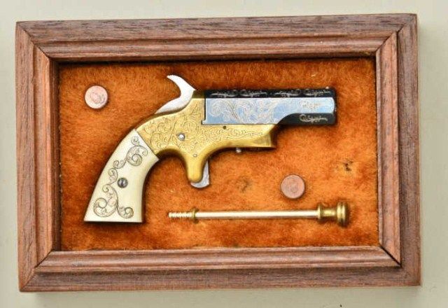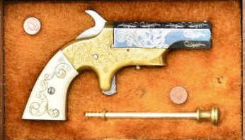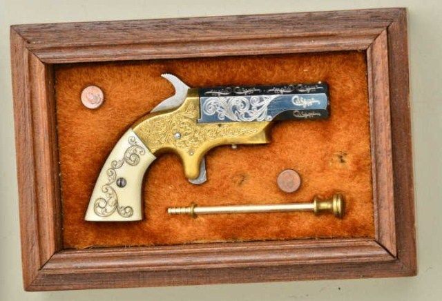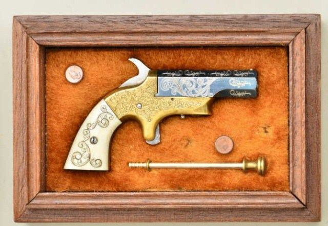Miniature half scale Southerner Deringer, engraved and cased with scrimshawed ivory grips probably by WH Smith but unmarked. Condition is excellent, and an attractive miniature. Est.;$700-$1,400.