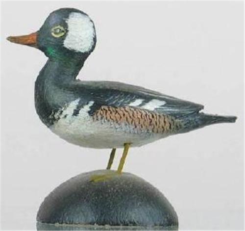 Miniature hooded merganser drake by A. E. Crowell, East Harwich, MA in XOC with rectangular impressed brand on the bottom of the base. (decoy)