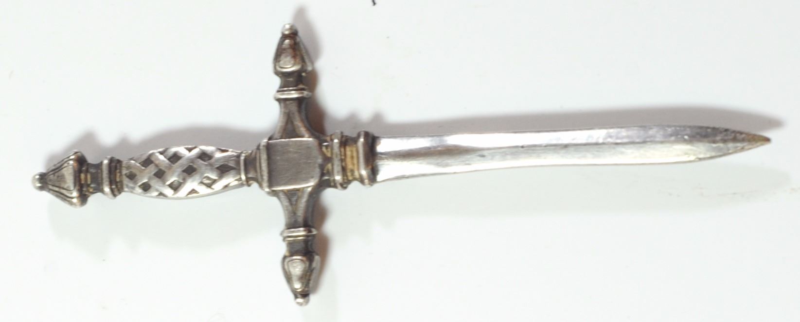 Miniature knife, letter opener (?) by Christofle, France, first half of the 20th century, silver plated brass, shaped like an antique sword, signed, length: 9.5 cm.