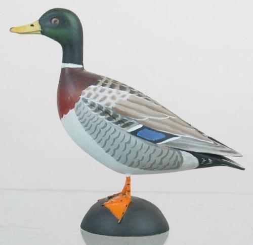 Miniature mallard drake by James Lapham in XOC. "James Lapham, Dennisport, Mass" and "Mallard Drake" written on the bottom of the base. (decoy)