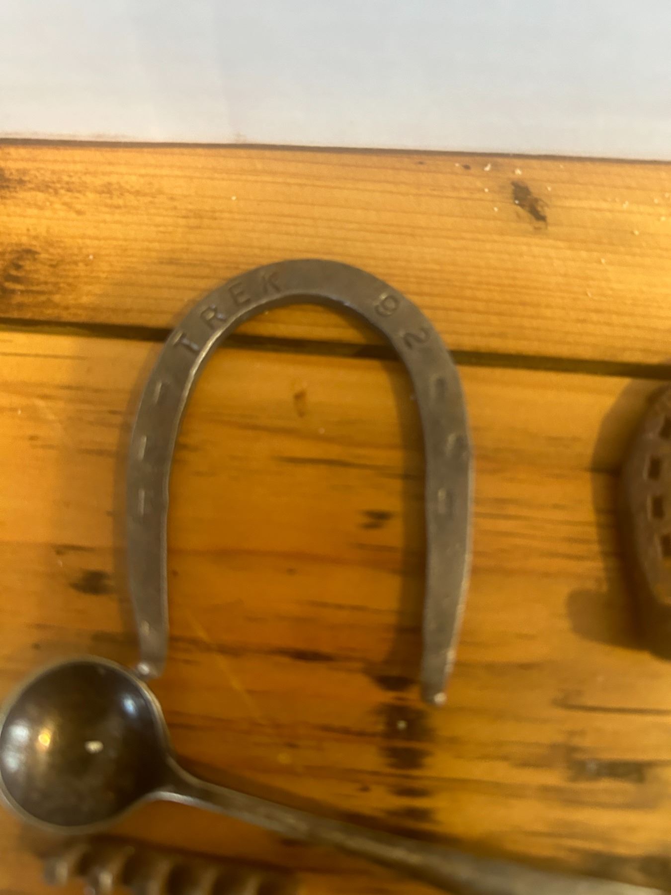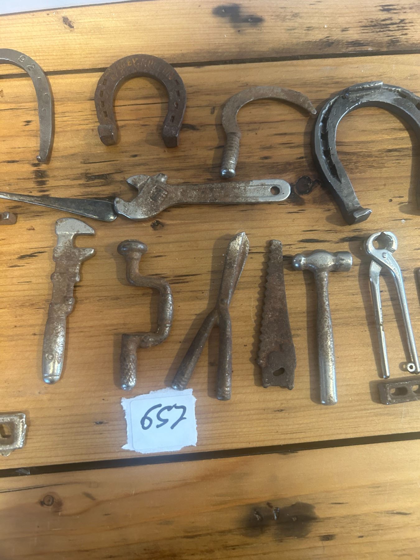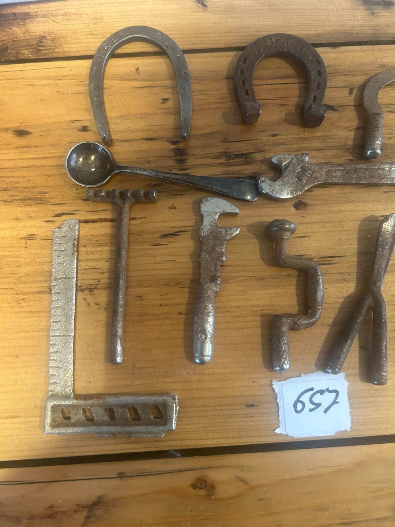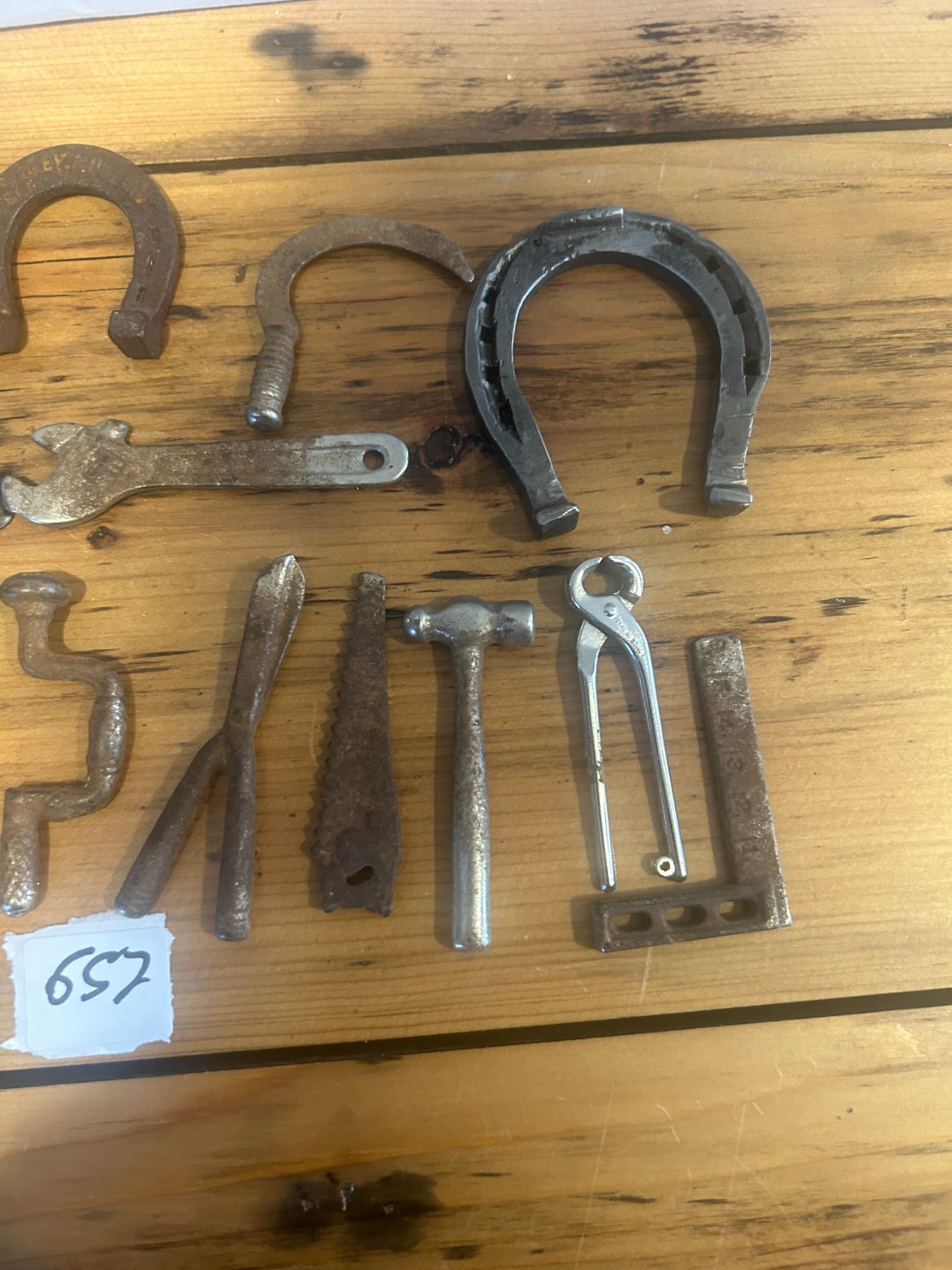 Miniature metal tools, horse shoes, etc. Salesman sample style