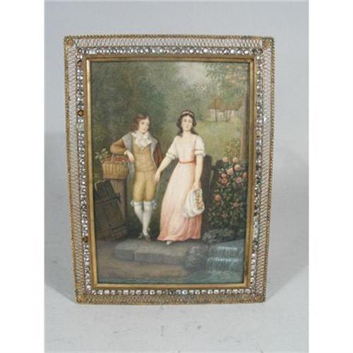 J. Fortsch, Miniature of a Courting Couple, German, 19th/20th c. - Finely detailed watercolor of a young courting couple in a charming picturesque country landscape with cottage. The couple stands in an open gateway with a pink rosebush trailing along the fence to her left, and he rests his elbow on a basket of cherries, symbolizing the nature and future of their love. A dove also flies above. A very charming miniature full of symbolism and presented in a gold wirework frame with paste 'jewels', glass back with "LC" monogram in gold script letters set against a purple velvet backing (missing 7 'jewels'. Watercolor on celluloid, signed in the lower right corner "J. Fortsch". Watercolor measures 7"h x 4-5/8"w, dimensions overall with frame 8.5"h x 6.25"w