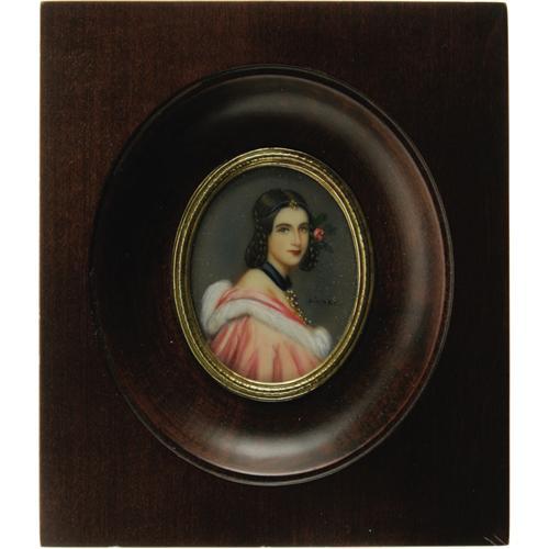 <B>Superb Signed Victorian Miniature on Ivory of a Beautiful Young Woman, Closely Resembling Jenny Lind.</B></I> While the piece carries no identification, it bears a very strong resemblance to the famed singer. In any case, it is a masterful portrait, signed "Dinare" in the field above her chest. Wood frame appears to be a more modern replacement. The oval portrait itself is approximately 1.75" x 2", the frame is 4" x 4".