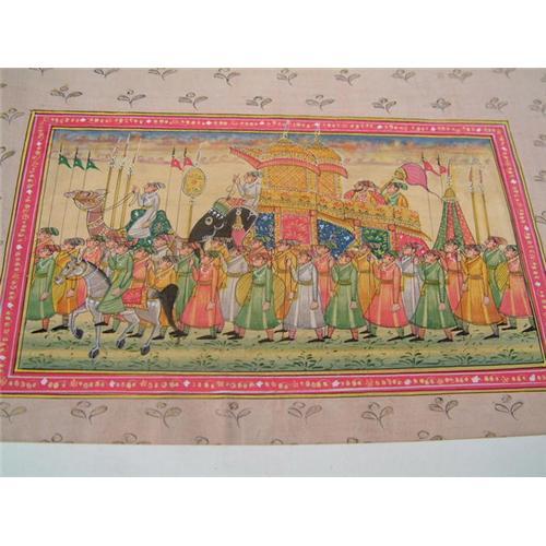 Miniature painting on antique Indian manuscript. It illustrates a procession of a maharajah riding an elephant with attendants riding horse, camel, or elephant. The colors are vivid and the painting has very minute details done with great skill. Size: 11" X 7" (28 cm X 18 cm.). Estimated value: $600.