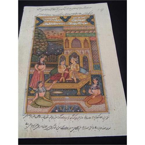 Miniature painting on antique Indian manuscript. It illustrates a noble man with an entourage of 4 entertaining women.The painting is rendered with great skill with minute details on a large page format. Size: 13.3" X 9" (34 cm X 23 cm.). Estimated value: $800.