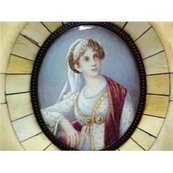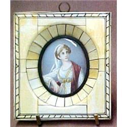 Miniature painting on ivory, portrait of a woman with veil, artist initialed A, in ivory frame, 2 3/4" high on portrait, frame measures 4 1/2" high x 4" across Estimate 100/200