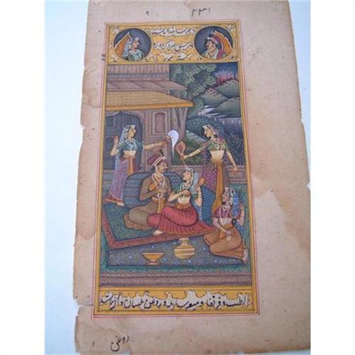 Indian miniature painting on paper representing an emperor with 4 female attendants. The details are minuscule with high quality of painting. Above, are the miniature paintings of the emperor and empress in a round panel. Dimensions: 9" X 5.5" (23 cm. X 14 cm.).