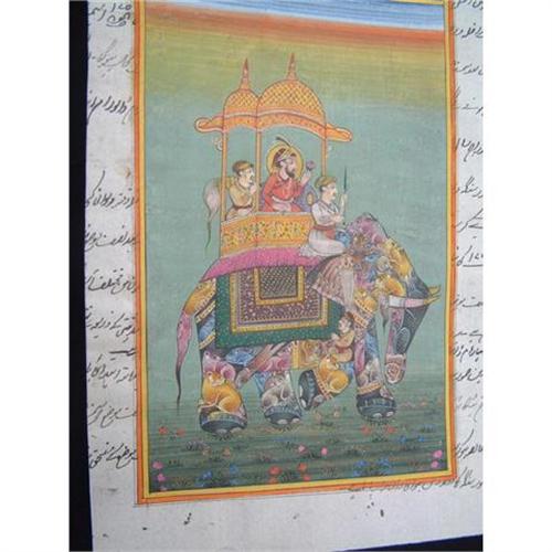 Indian miniature painting on paper representing an emperor riding an elephant with 2 attendants. The details are minuscule with high quality of painting. The elephant legs and trump are painted with miniature human figural and several animals.