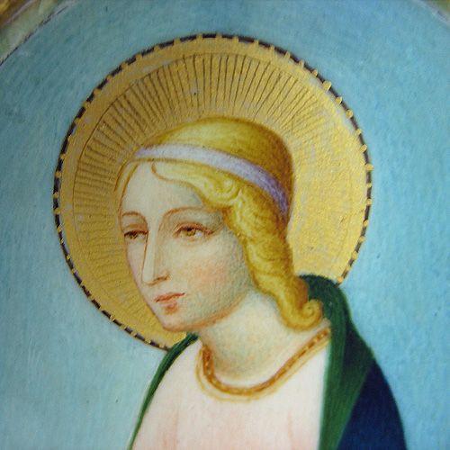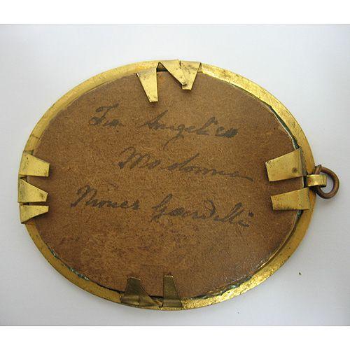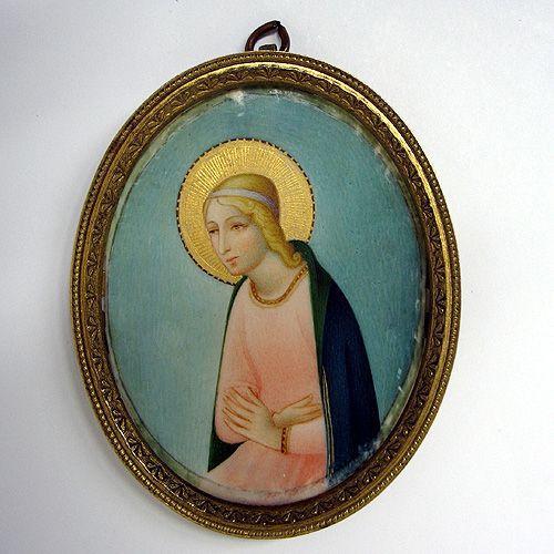"Miniature portrait of Madonna painted on ivory with gilt halo; inscription on reverse ""Fra Angelico Madonna"" and signed Nimes Gardelli; in brass frame; late 19th to early 20th C.; image size 2 1/4 inches x 1 3/4 inches; frame size 2 3/4 inches x 2 1/4 inches (some loss around edges; glass chipped on edges)"