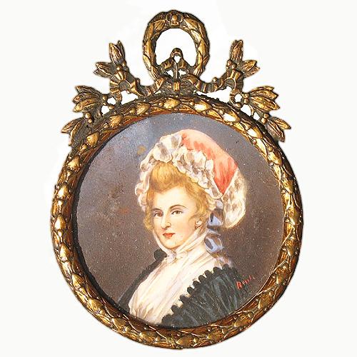 Miniature portrait of a lady painted on ivory in brass frame; signed lower right (unreadable); 2" diameter; frame size 2 1/2" x 2"; 19th C. (no visible defects)