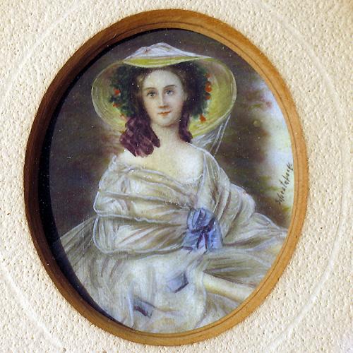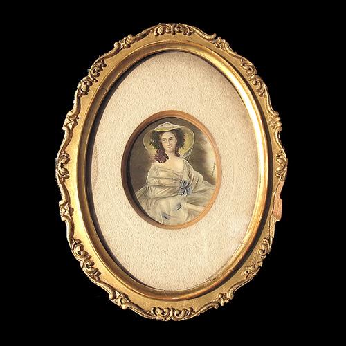 Miniature portrait of a lady painted on ivory in gilt wood frame; signed middle right; image size 3 1/4" x 2 1/2"; frame size 8 1/4" x 6 1/4" (discoloration on mat; frame edge cracked and chipped