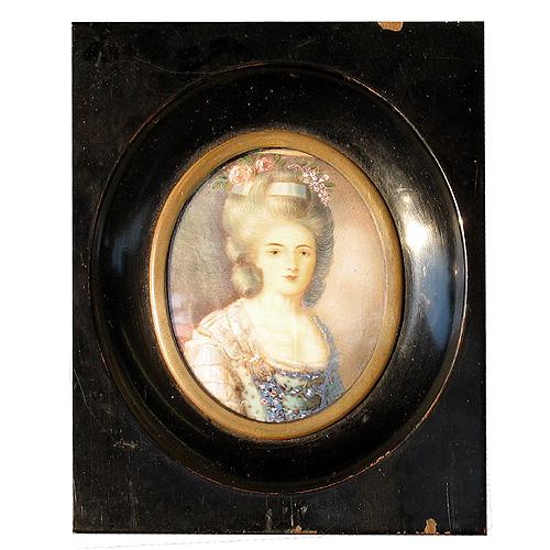 Miniature portrait of a lady painted on ivory in lacquered wood frame; image size 3 1/2" x 3"; frame size 6" x 4 1/2"; unsigned (minor crazing on painting and a few small chips on frame)