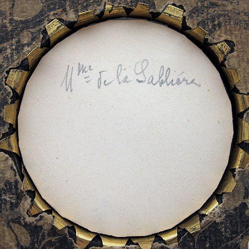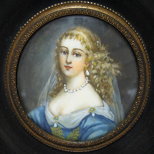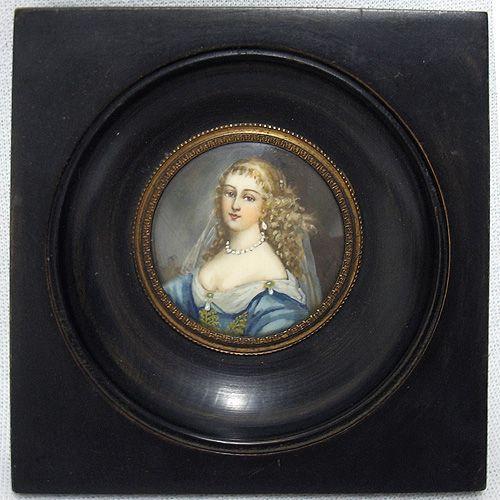 Miniature portrait painting on ivory of a woman;signed on right background (unreadable); framed; 19th C.; image size 2 inch diameter; frame size 4 1/2 inch square (no visible defects)