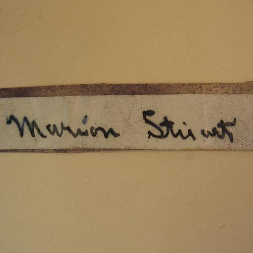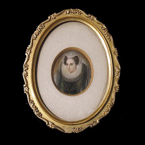 Miniature portrait painting on ivory of Marion Stuart in gilt wood frame; unsigned (name of subject on back); image size 3" x 2 1/2"; frame size 8 1/4" x 4 1/2"; 19th C. (portrait has two cracks top and bottom)