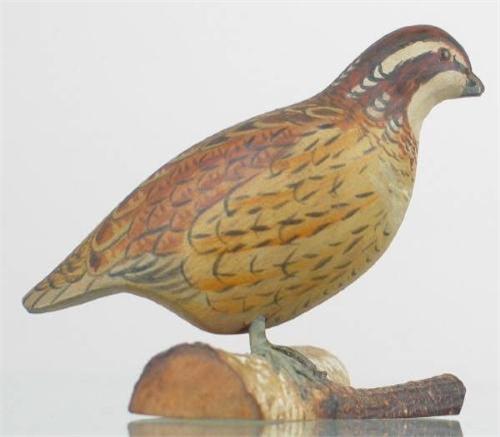Miniature quail on a birch "log" by J. Ahearn. Signed "J. Ahearn" and "Bob White" along with collection mark "M-3" on the bottom of the base. (decoy)