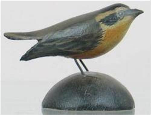 Miniature red breasted nuthatch by A. E. Crowell, East Harwich, MA in XOP. #5 and a rectangular brand on the bottom of the base. (decoy)