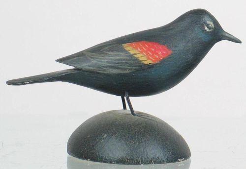 Miniature red-winged blackbird by A. E. Crowell, East Harwich, MA in XOC. Rectangular impressed brand on the bottom of the base.