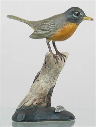 Miniature robin by Cape Cod carver Steve Weaver. In XOC. Signed on the bottom and dated 2004. Carved feather on the base. (decoy)