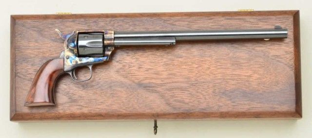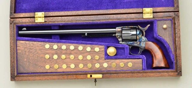 Miniature ½ scale Colt Buntline single action revolver showing Colt address on barrel, serial # 2032. Blue and case hardened finished, wood grips and cased. Marked with patent dates and caliber 45. Excellentcondition in box. Est.; $600-$1,200.