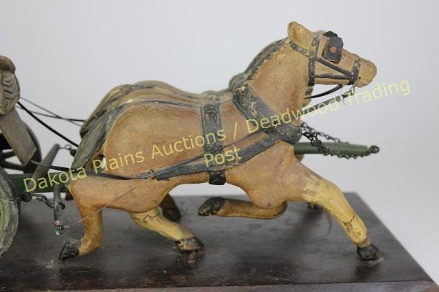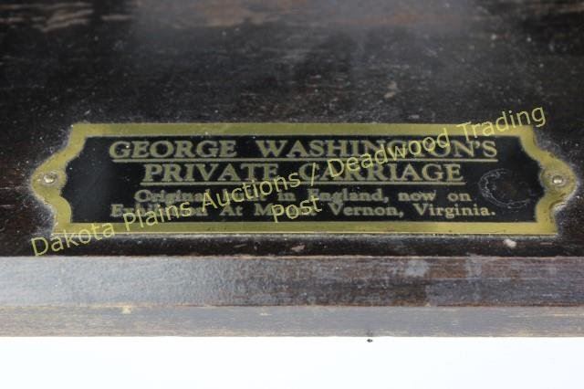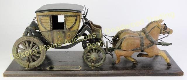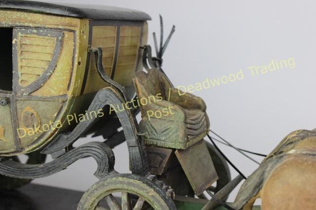 George Washington's private coach in wood, horses paper mache, 23" X 8" tall, shows considerable age and patina, horses with some loss, craquelure and a couple of old repairs, good overall. A like example on
