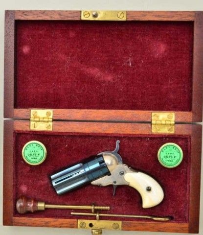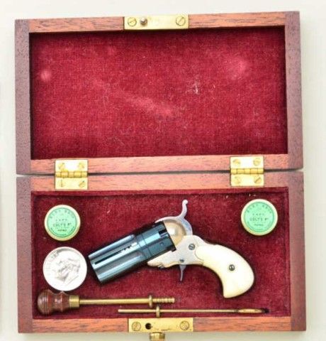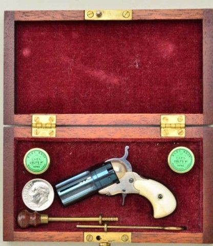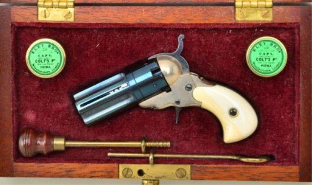 Miniature ½ scale percussion Pearson prototype Paterson 5 shot revolver with sliding bayonet and ivory grips cased with accessories marked “LH SMITH” numbered 19. This well known craftsman from Florida ishighly regarded for his fine miniatures. Condition is excellent, formally Jerry Tralins collection. Est.;$700-$1,400.