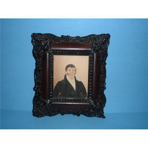 A miniature watercolor on paper of a portrait of a gentleman in its original composition frame.