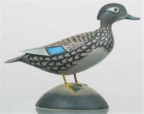 Miniature wood duck hen with "Wood Duck Hen" and "James Lapham, Dennisport, Mass" on the bottom in ink. XOC. (decoy)