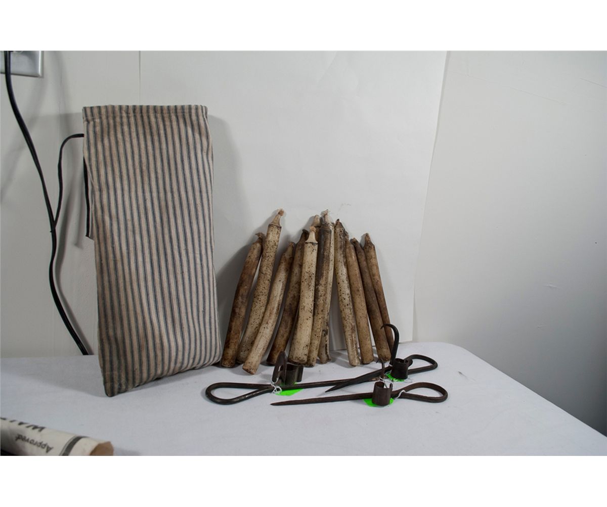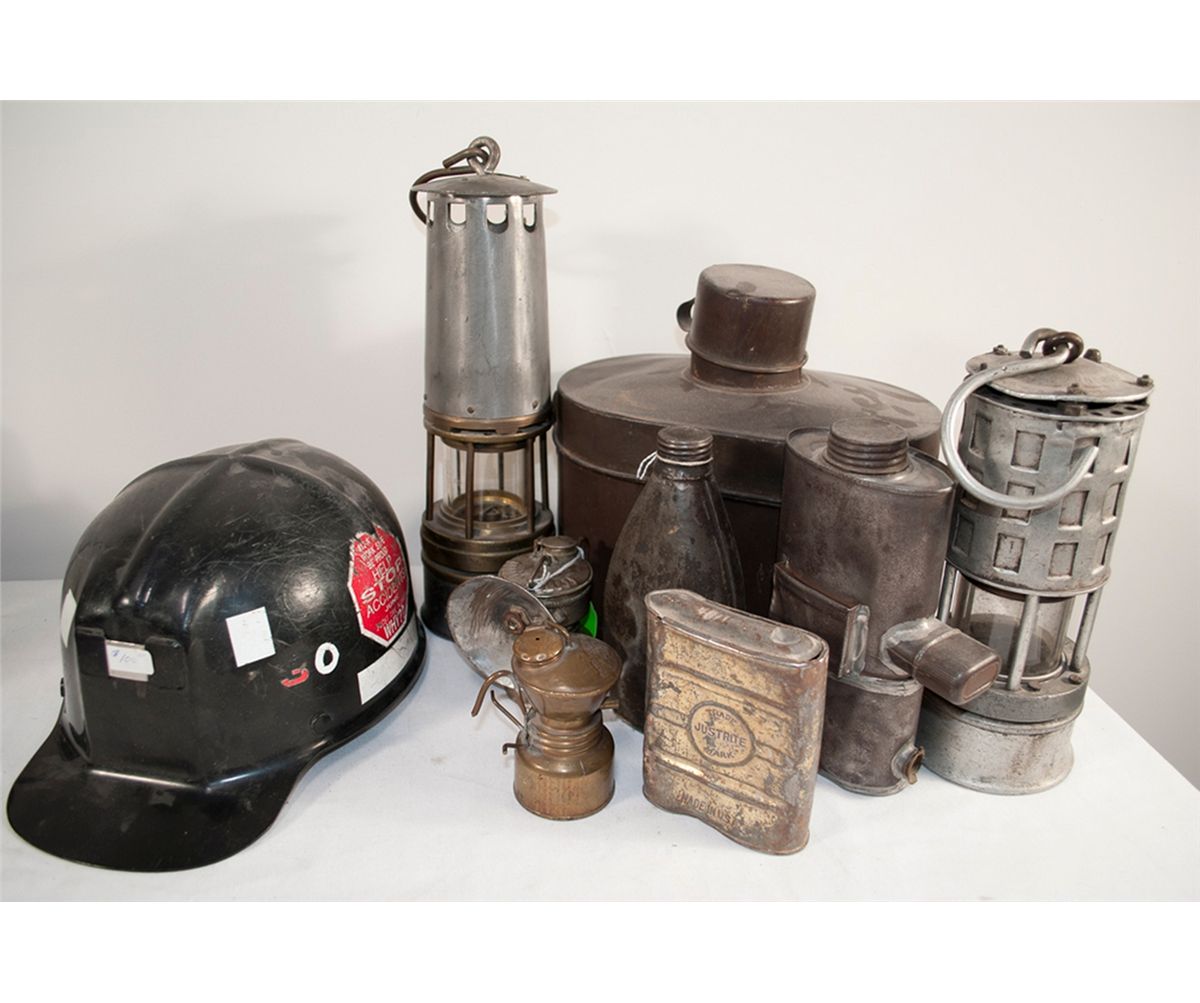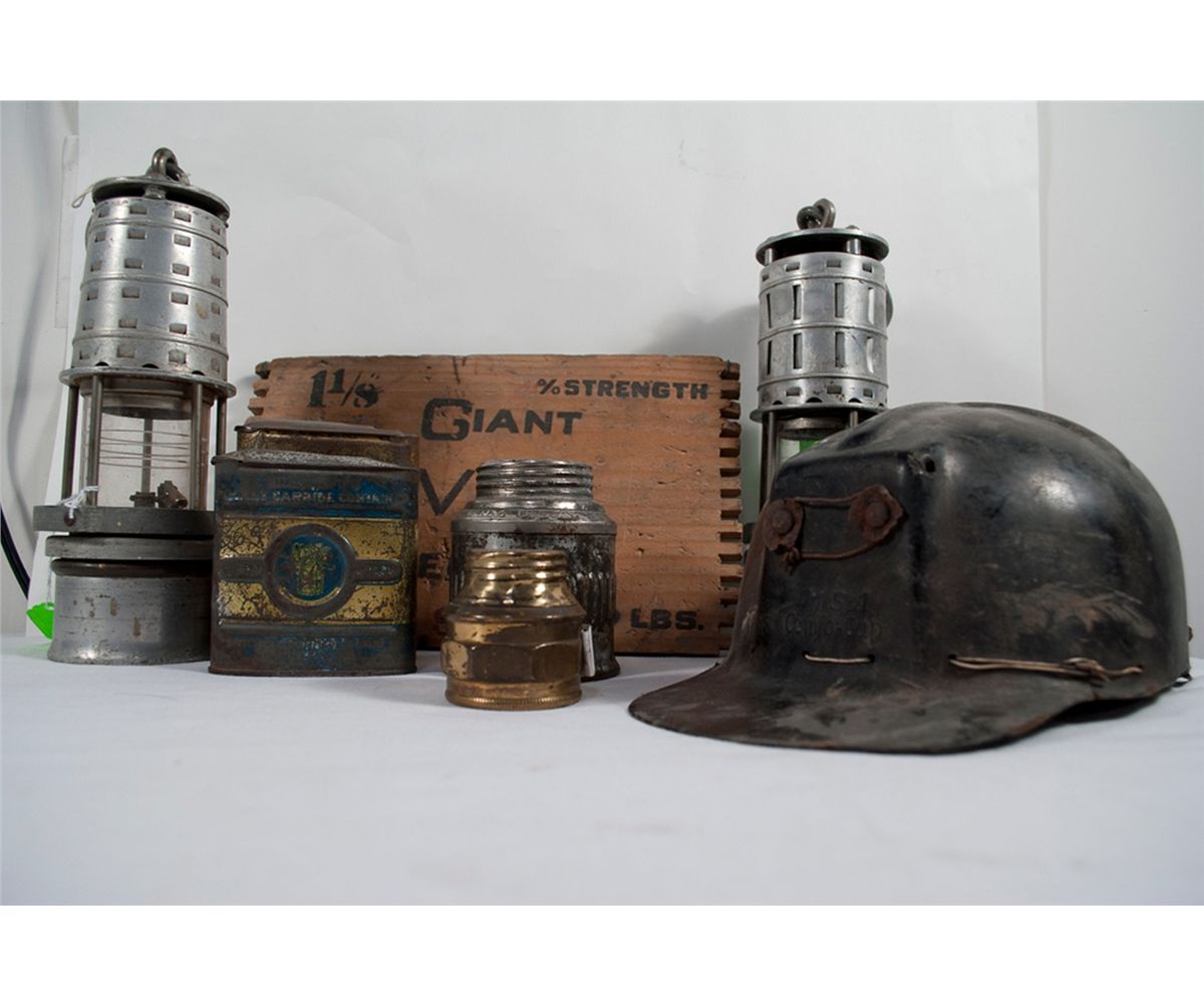 This is an entire mining hard goods collection which includes miners' candlesticks, carbide lamps, lunch pails and even a hard hat. Also featured are canteens, a smelter pot and containers for plug tobacco, blasting caps and fuses. There is also quite an assortment of mining tools, including mallets, saws and other woodworking implements. This is a very extensive collection that covers several aspects of mining life. A great archive for the hard rock enthusiast. -60083
