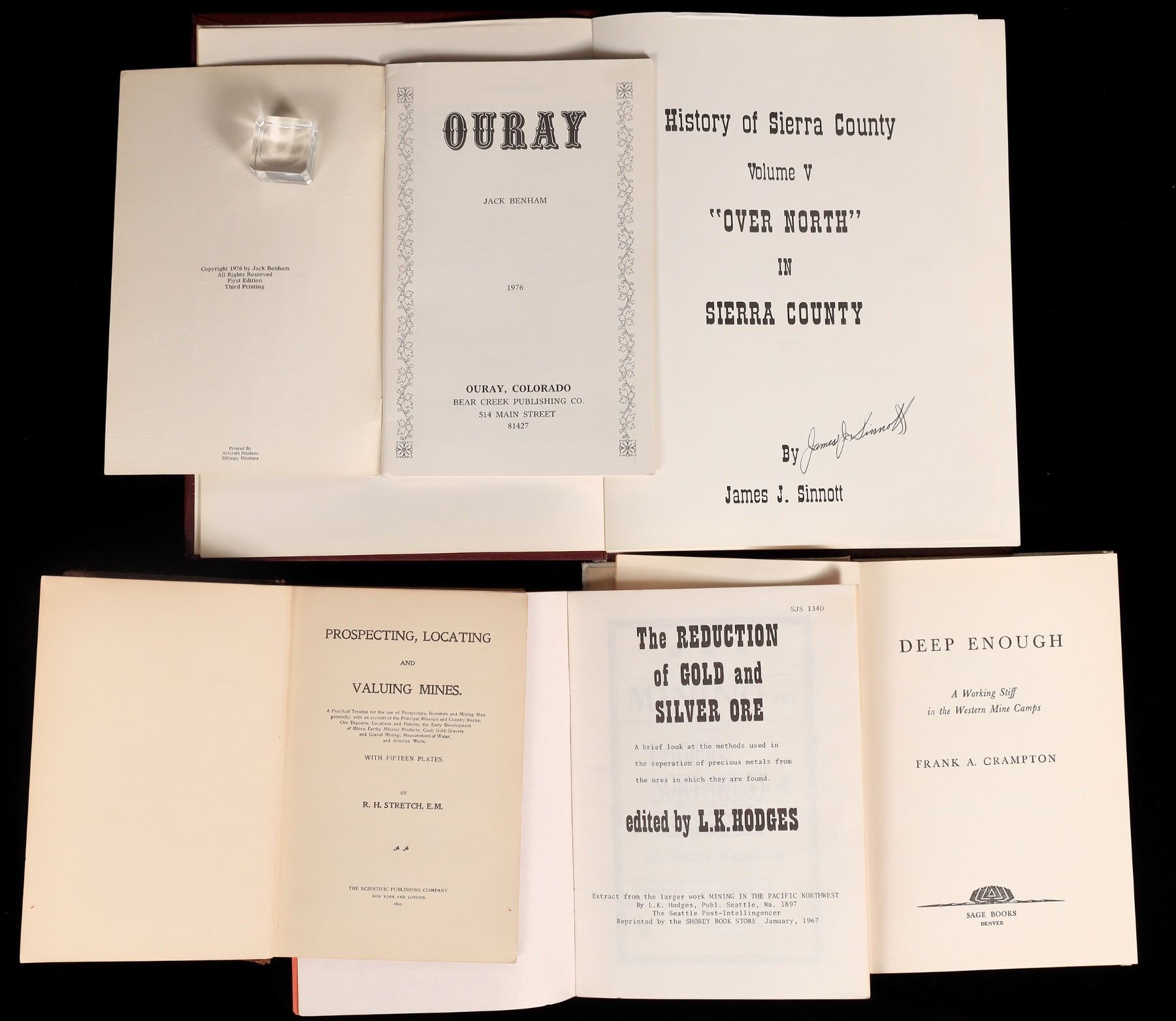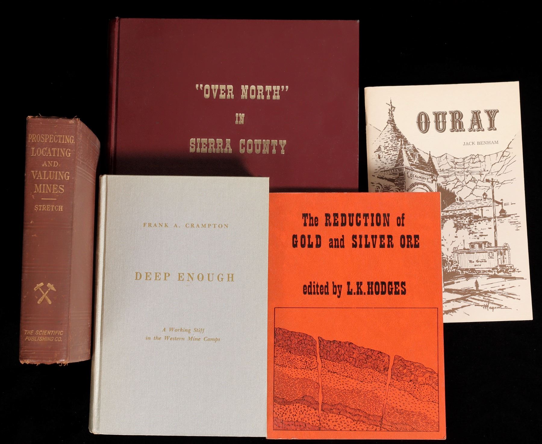 1899 Prospecting, Locating and Valuing Mines by Stretch, 1956 Deep Enough by Crampton, Reduction of Gold and Silver Ores by Hodges, Ouray by Benham, Over North in Sierra County by Sinnott.