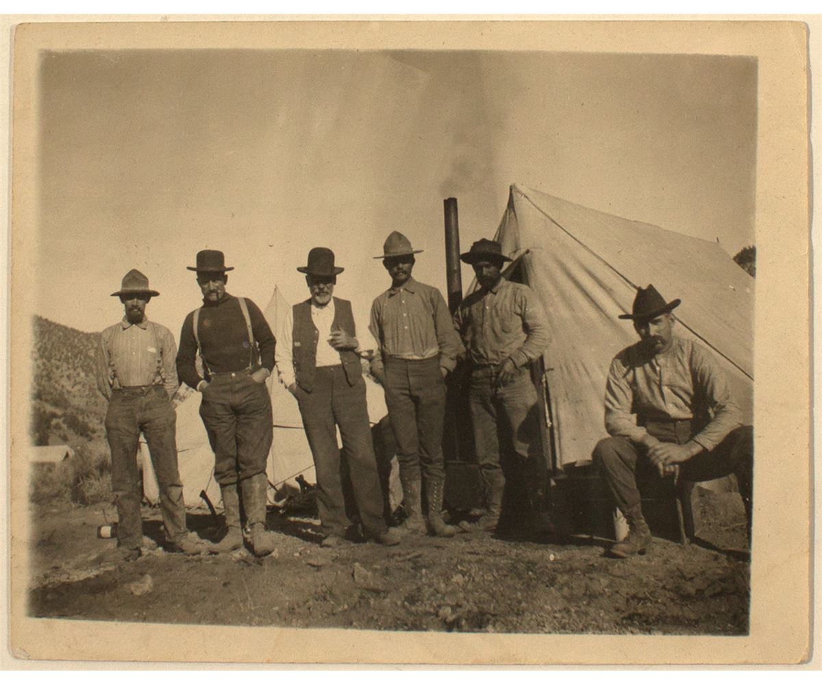This 4" x 5" photograph shows six men sitting outside of a tent with stovepipe. There is another tent in the background (lower left) and sagebrush covered hills. The back of the card has the following pen notation: "James A. McLaughlin at left of stovepipe of tent." This could be the same James McLaughlin that was the Indian agent who ordered the arrest of Sitting Bull. But it could also be the James Anthony McLaughlin who is listed in the 1920 census as being a shift boss for a silver mine in Tonopah. Photographs on ancestry.com look close to the man in our photo. It definitely appears to be a mining camp. Perhaps McLaughlin was visiting a mining camp when he was an Indian agent. Photograph is curved.
