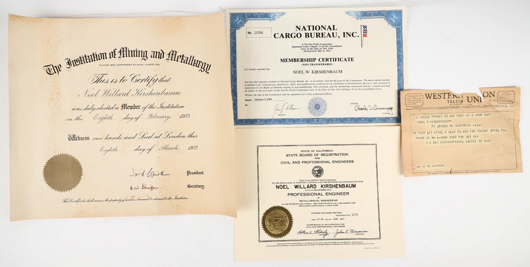 Mining Certificates for Noel Kirschenbaum. A group of industry certs for Mining Chemical Engineer Noel Kirschenbaum. Institution of Mining and Metallurgy 1973, California Civil Engineer 1967, National Cargo Bureau 1993.