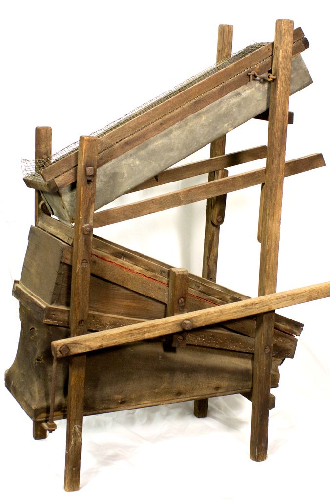 While “Gold Rush” may make many people think of gold pans, sluice boxes, and other methods of using water to separate rock from gold, water was unavailable in many mining claims. To separate material without water, tools such as this Dry Washer were often used. A pail of rocks and dirt would be poured onto the top screen. Large rocks would sit atop the screen, and smaller material would pass through into the reservoir. The reservoir would be shaken, and the fine matter would fall through a slot into the riffled canvas tray. The handle would be used to pump air through the bellows at the bottom of the stand. The force of the air moving through the canvas material would blow away the lighter grit and leave behind the gold. This dry washer is 32” tall, 21” long, and 10” wide. The bellows still works, although it is dry-rotted and there are some holes in both the bellows and the canvas. -60199