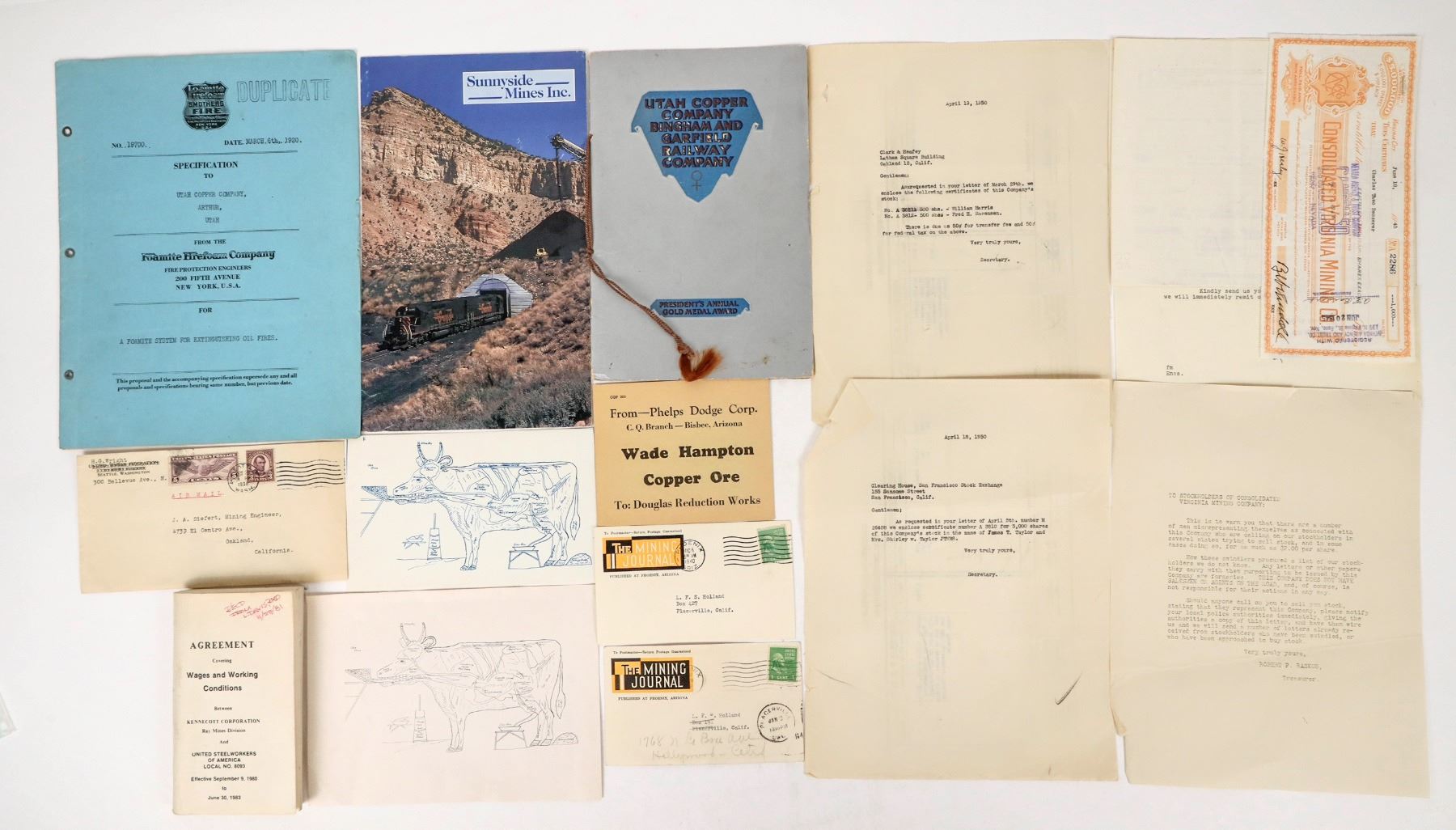 Lot of 11. Brochures, postal cover, drawing of a steer showing a mine operation, pots cards, Kennecott mine handbook.