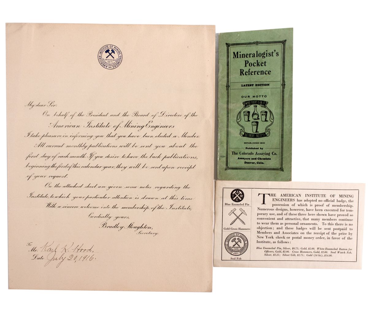 Lot of two items. 1) Mineralogist’s Pocket Reference booklet, published by the Colorado Assaying Co. in Denver, 48 pgs. 3" x 6". 2) Printed letter of new membership from the American Institute of Mining Engineers to Mr. Karl K. Hood, dated July 20, 1916.