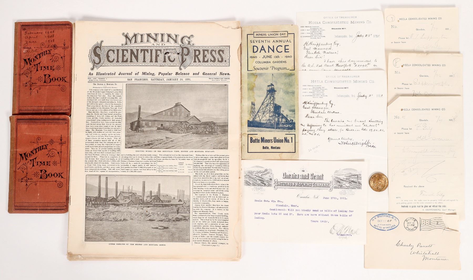 About 12 pieces of c. 1888-1940 mining ephemera. 4 issues of Mining Scientific Press, 1891-1902; 1891 has condition issues.1940 Butte Miners Union dance program-stains mostly near front and back. 1906-08 and 1906-07 monthly time book. 6 small correspondences. 1936 Helena gold mining token.