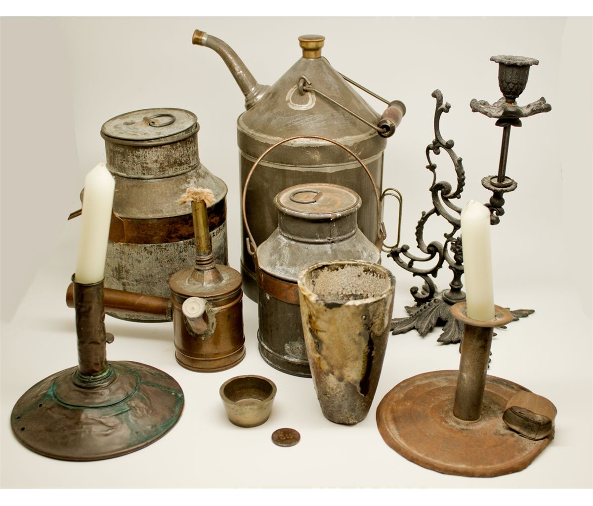 Lot of 10: 1) black cast iron candlestick from the Adele Reed collection. Very ornate, measures 10.5". 2) copper oil burning lamp with hanging hook and handle, approx. 7" x 2.5" in diameter, handle is 4" long. 3) Assay Crucible, 3" in diameter at the top, 5" tall. 4) brass Apothecary weight measuring cup, weighs 123 grams. 5 & 6) Miner's tin lunch pails, copper banded with wire handles. The smaller unit is 6" high x 4" in diameter, the larger unit is 7.5" x 5.5" dia. 7 & 8) Copper candle sticks, both with thumb lever adjusters. They are approx. 5.5" dia x 5". 9) is an oil can, with brass caps and a wooden bail handle. It measures approx. 10" x 6", soldered tin construction, with a Lion symbol and "M J" on either side of the lion, with the number "3" below stamped into the top above the spout. This item is in excellent condition. 10) an Assay weight which resembles a token. The markings indicate "Two Drachmas" and "3 i j" on both faces. - Jacobitz Collection -60324